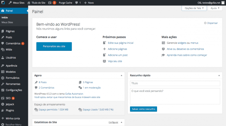Tendo em vista as duas versões do WordPress, fica claro que a ferramenta é bem mais fácil de usar que na versão .org, pois possui um painel simplificado, como mostra a imagem abaixo.